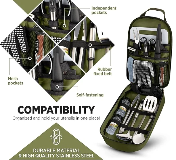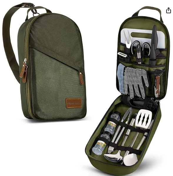 Bag Offer Gwersylla Awyr Agored Cludadwy, mae gan bob offer ei gwdyn dynodedig ei hun, felly nid yw unedau'n cael eu harogli, eu crafu na'u difrodi wrth eu storio neu wrth ei gludo. Mae'n darparu mynediad hawdd i'ch offer coginio ac mae ganddo sêl zip diogel