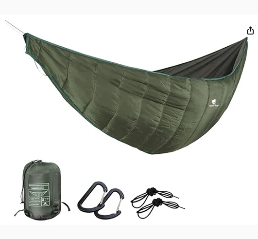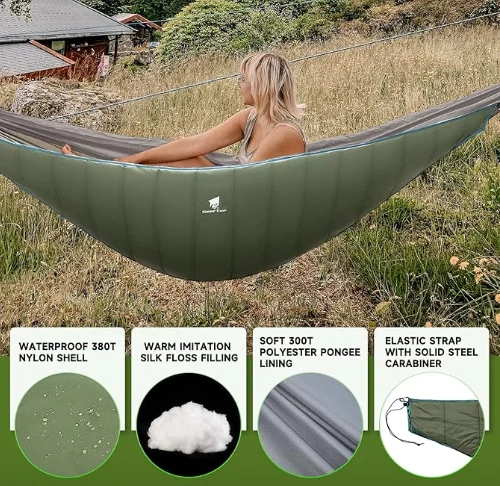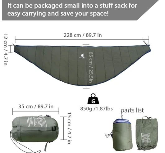 Mae'r cwilt hamog 3 - 4 tymor yn ddelfrydol ar gyfer tymereddau o 41 ° F i 68 ° F; Mae wedi'i siapio'n berffaith i ffitio hongian hamog, sy'n eich cysgodi o'r gwynt ac yn eich cadw'n gynnes wedi'u cocŵn.
